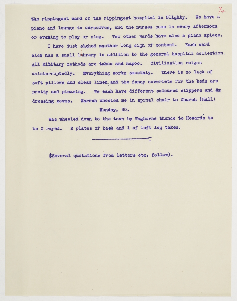 I have just sighed another long sigh of content. Each ward also has a small library in addition to the general hospital collection. All Military methods are taboo and napoo. Civilization reigns uninterruptedly. Everything works smoothly. There is no lack of soft pillows and clean linen, and the fancy coverlets for the beds are pretty and pleasing. We each have different coloured slippers and dressing gowns. Warren wheeled me in spinal chair to Church (Hall)