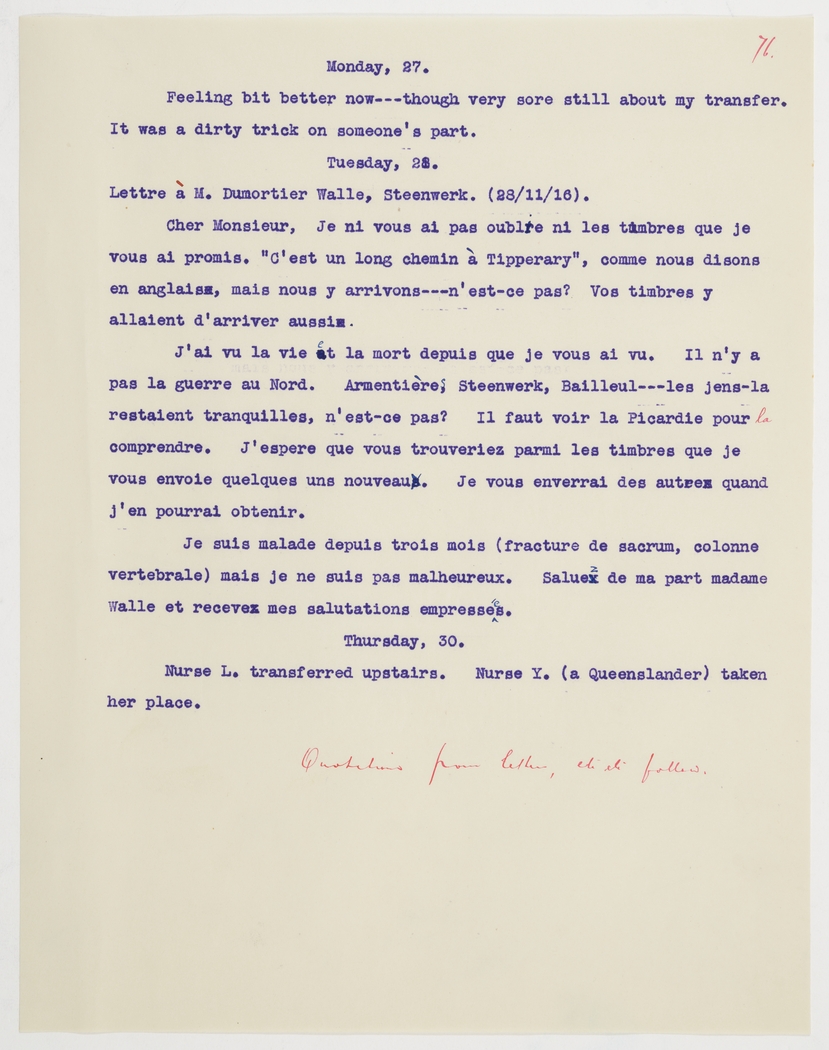Lettre à M. Dumortier Walle, Steenwerk. (28/11/16).