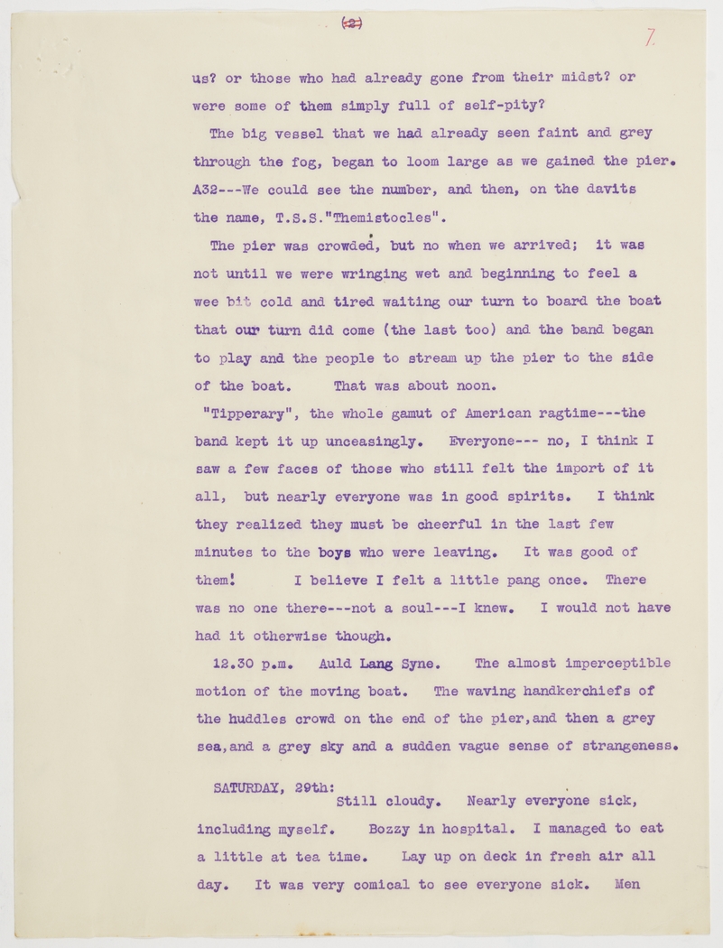 "Tipperary", the whole gamut of American ragtime---the band kept it up unceasingly. Everyone--- no, I think I saw a few faces of those who still felt the import of it all, but nearly everyone was in good spirits. I think they realized they must be cheerful in the last few minutes to the boys who were leaving. It was good of them! I believe I felt a little pang once. There was no one there---not a soul---I knew. I would not have had it otherwise though.