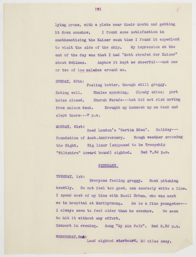Everyone Feeling groggy. Boat pitching heavily. Do not feel too good, can scarcely write a line. I spend most of my time with Basil Urban, who was next me in hospital at Maribyrnong. He is a fine youngster---I always seem to feel older than he somehow. We seem to hit it without any effort.