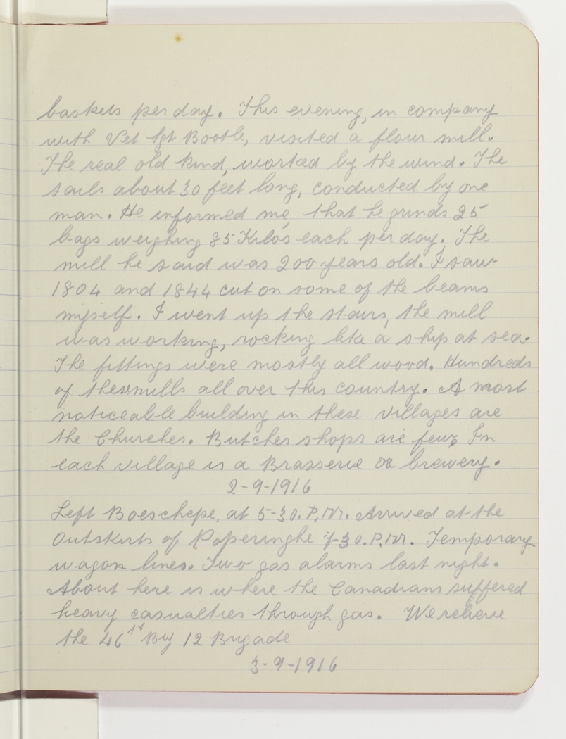 2.9.1916 Left Boeschepe, at 5.30.P.M. Arrived at the Outskirts of Poperinghe 7.30.P.M. Temporary wagon lines. Two gas alarms last night. About here is where the Canadians suffered heavy casualties through gas. We relieve the 46th Bty 12 Brigade