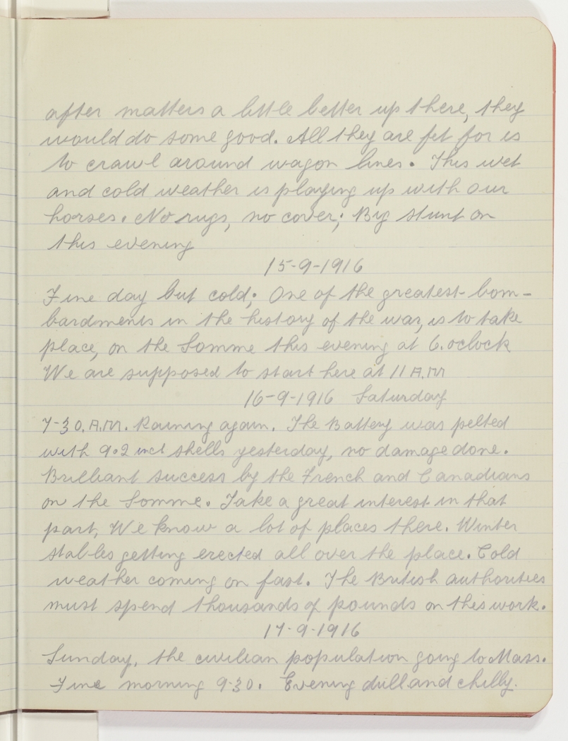 15.9.1916 Fine day but cold; One of the greatest bombardments in the history of the war, is to take place, on the Somme this evening at 6. oclock We are supposed to start here at 11 A.M