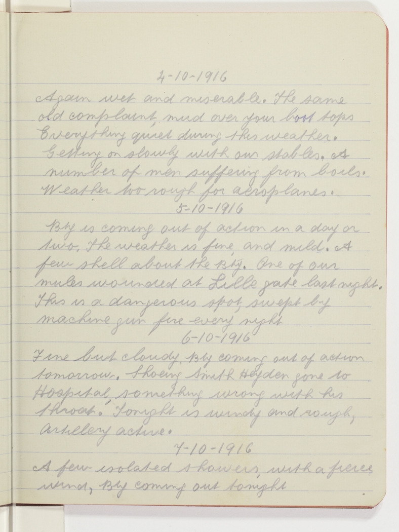 5.10.1916 Bty is coming out of action in a day or two. The weather is fine, and mild. A few shell about the Bty. One of our mules wounded at Lille gate last night. This is a dangerous spot, swept by machine gun fire every night.