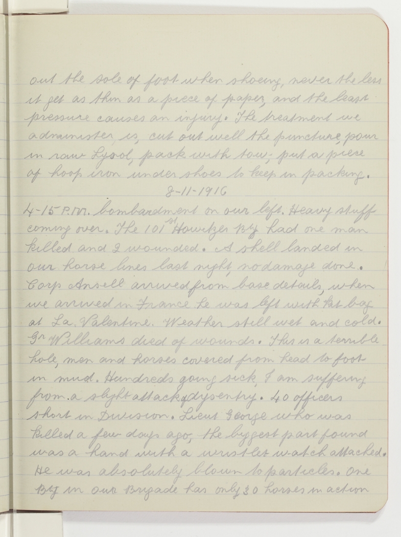 8.11.1916 4.15 P.M. bombardment on our left. Heavy stuff coming over. The 101st Howitzer Bty had one man killed and 2 wounded. A shell landed in our horse lines last night, no damage done. Corp Ansell arrived from base details, when we arrived in France he was left with kit bag at La Valentine. Weather still wet and cold. Gr Williams died of wounds. This is a terrible hole, men and horses covered from head to foot in mud. Hundreds going sick, I am suffering from a slight attack of dysentry. 40 officers short in Division. Lieut George who was killed a few days ago, the biggest part found was a hand with a wristlet watch attached. He was absolutely blown to particles. One Bty in our Brigade has only 30 horses in action