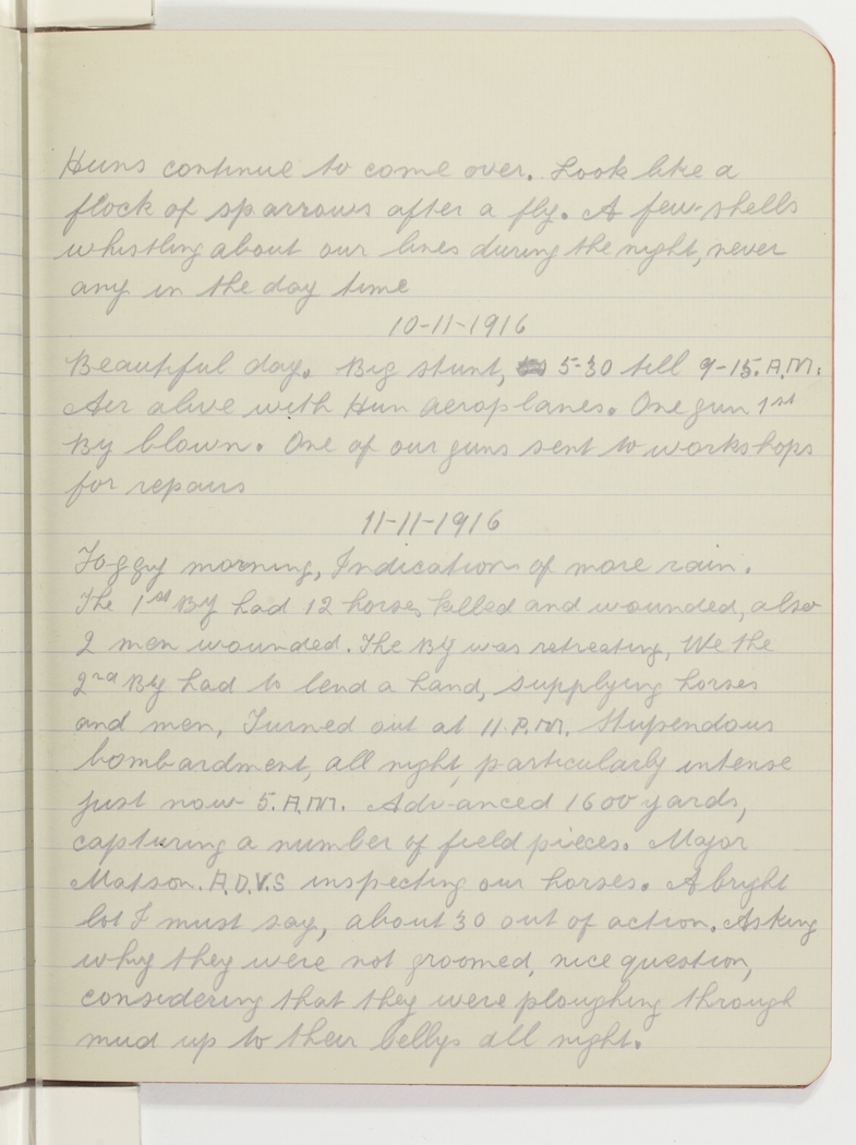 10.11.1916 Beautiful day. Big stunt, 5.30 till 9.15. A.M. Air alive with Hun aeroplanes. One gun 1st Bty blown. One of our guns sent to workshops for repairs.