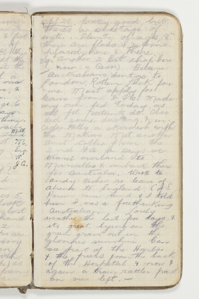 29 Another 2 Batt chap here now: – Carr). Believe Australians don't go to London. Rotten luck for me. Must apply for leave from H Qs. Made my own bed today as all fit patients do. Also did some dusting & incidentally a skirmish with the Matron. Met another Aust cobber from the 2nd FA. He says we travel overland to Marseille & embark there for Australia. Wrote to Andy Fisher re leave of absence to England. C of E Parson came round & I told him I was a freethinking Australian. Lovely weather the last few days & its great, lying on the green grass out in the glorious sunshine. Can see part of the Harbor & the piers from the back of the Hospital & now & again a train rattles past on our left.
