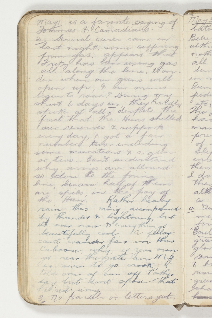 2 Several cases came in last night, some suffering from gas. Appears that Fritz has been using gas all along the line. Wonder when our guns will open up, & our mines begin to roar? During my short 6 days in, they hardly spoke at all – despite the fact that the Huns shelled our reserves & supports every day, & got a fair number two – including some munitions & a gun or two. Can't understand why civies are allowed so close to the firing line, because half of them are spies, in the pay of the Hun. Rather heavy rain this mng, accompanied by thunder & lightening, but its over now & everythings beautifully cool. A fellow cant wander far in this Caboose, why, if you even go near the gate an MP is sure to go crook, & I told one of em off t'other day, but don't spose that helped any.