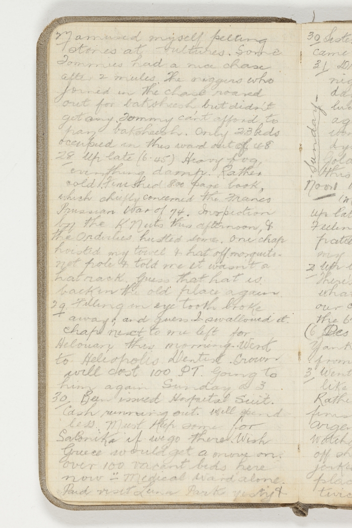 27 amused myself pelting stones at vultures. Some Tommies had a nice chase after 2 mules. The niggers who joined in the chase roared out for baksheesh but didn't get any. Tommy can't afford to pay baksheesh. Only 23 beds occupied in this ward out of 48