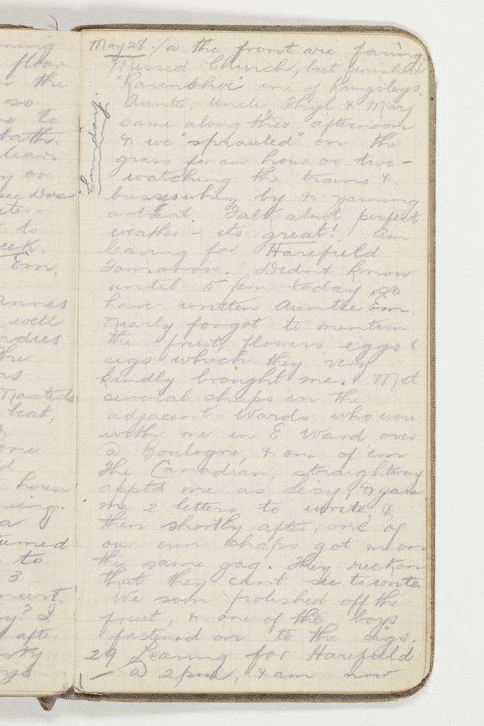May 28 at the front are faring. Missed Church, but finished "Ravenshoe" one of Kingsleys. Auntie, Uncle, Phyl & Mary came along this afternoon & we "sprawled" on the grass for an hour or two – watching the trains & buses whiz by & yarning a treat. Talk about perfect weather – its great! Am leaving for Harefield tomorrow. Didnt know until 5 pm today, so have written Auntie Em. Nearly forgot to mention the fruit flowers, eggs & cigs which they brought me. Met several chaps in the adjacent Wards who were with me in E Ward over at Boulogne, & one of em the Canadian, straightaway apptd me as Sec'y, & gave me 2 letters to write, & then shortly after, one of our own chaps got me on the same gag. They reckon that they cant see to write. We soon polished off the fruit, & one of the boys fastened onto the cigs. [in margin] Sunday