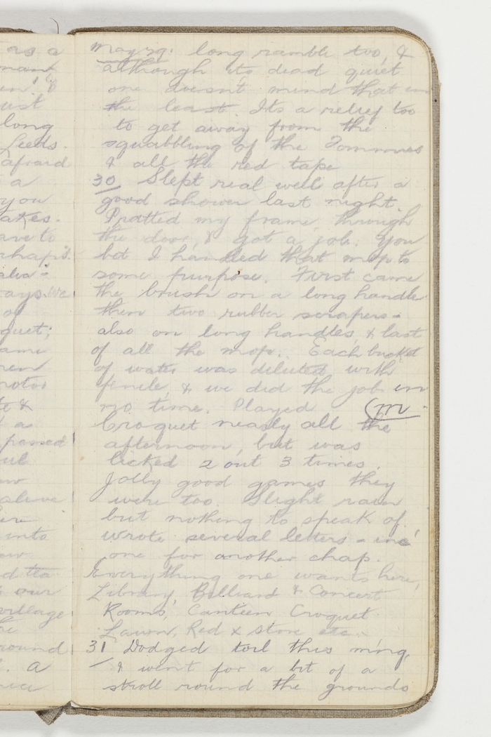 Played croquet nearly all the afternoon, but was licked 2 out 3 times. Jolly good games they were too. Slight rain but nothing to speak of. Wrote several letters – incl one for another chap. Everything one wants here, Library, Billiards & Concert Rooms, Canteen Croquet Lawn, Red x store etc.