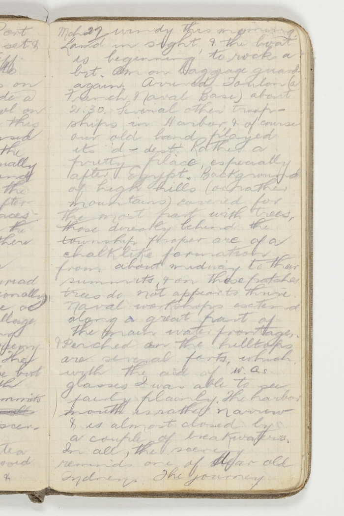Mch 27 windy this morning. Land in sight & the boat is beginning to rock a bit. Am on baggage guard again. Arrived Toulon (a French Naval Base) about 21.30. Several other troopships in harbour & of course our old band played its d---dest. Rather a pretty place, especially after Egypt. Background of high hills (or rather mountains) covered for the most part with trees, those directly behind the township proper are of a chalklike formation from about midway to their summits, & on these patches trees do not appear to thrive. Naval workshops extend along a great part of the main water frontage, & Perched on the hilltops are several forts which with aid of W.Qs glasses I was able to see fairly plainly. The harbor mouth is rather narrow & is almost closed by a couple of breakwaters. In all, the scenery reminds one of dear old Sydney. The journey