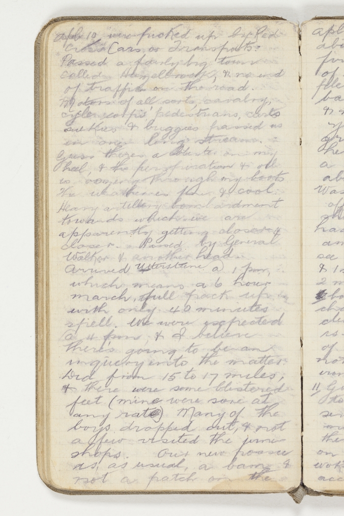 Apl 10 were picked up by Red Cross or Transports. Passed a fairly big town called Hazelbrook, & no end of traffic on the road. Motors of all sorts, cavalry, cycle corps', pedestrians, carts sulkies & buggies passed us in one long stream. Guess theres a blister on my heel & the perspiration & all is oozing through my boots The weather is fine & cool; Heavy artillery bombardment towards which we are apparently getting closer & closer. Passed by General Walker & another head. Arrived Uttersteene at 1 pm which means a 6 hour march, full pack up with only 40 minutes spell. We were expected at 4 pm & I believe there's going to be an inquiry into the matter. Did from 15 to 17 miles, & there were some blistered feet (mine were sore at any rate) Many of the boys dropped out, & not a few visited the wine shops. Our possie is as usual, a barn & not a patch on the