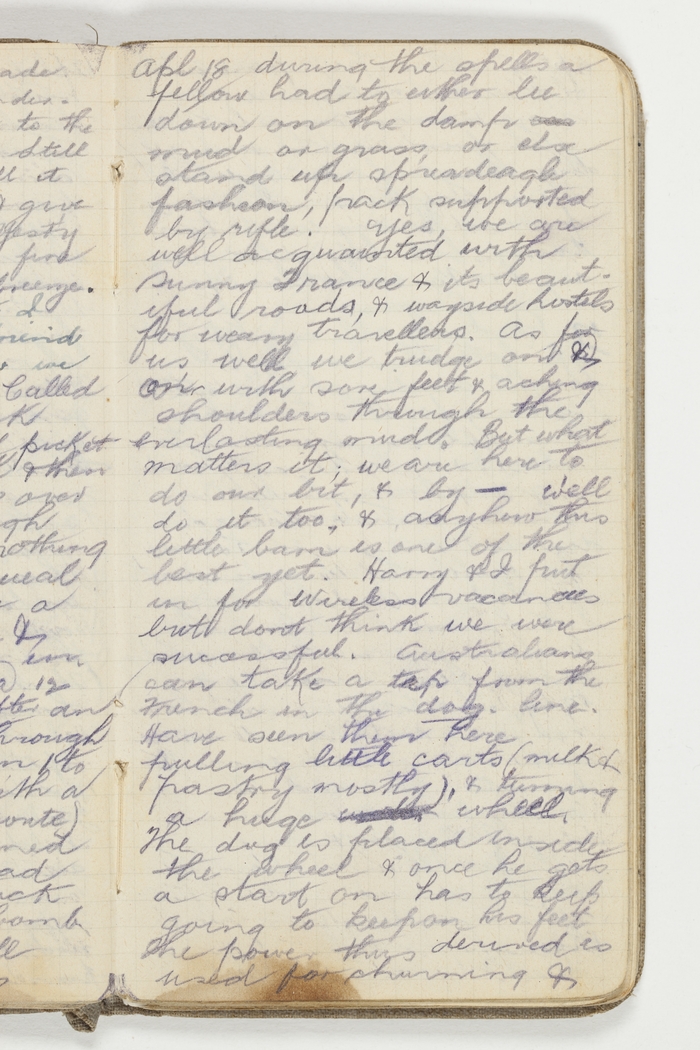 Apl 18 during the spells a fellow had to either lie down on the damp mud or grass, or else stand up spreadeagle fashion, pack supported by rifle. Yes we are well acquainted with sunny France & its beautiful roads & wayside hostels for weary travellers. As for us well we trudge on & on with sore feet & aching shoulders through the everlasting mud. But what matters it; we are here to do our bit, & by – we'll do it too, & anyhow this little barn is one of the best yet. Harry & I put in for Wireless vacancies but don't think we were successful. Australians can take a tip from the French in the dog line. Have seen them here pulling little carts (milk & pastry mostly), & turning a huge wheel. The dog is placed inside the wheel & once he gets a start on has to keep going to keep on his feet . The power thus derived is used for churning &