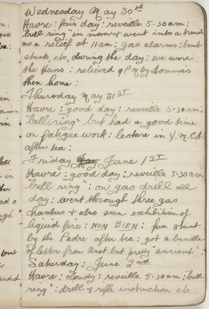 Havre : good day : reveille 5.30 am : "bull ring" : on gas drill all day : went through three gas chambers & also seen exhibition of liquid fire : NON BIEN : fun stunt by the Padre after tea : got a bundle of letter from Aust but pretty "ancient" :