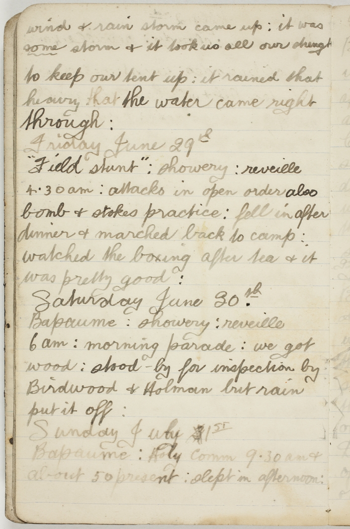 Bapaume : showery : reveille 6 am : morning parade : we got wood : stood-by for inspection by [Lt General] Birdwood & [NSW Premier] Holman but rain put it off :