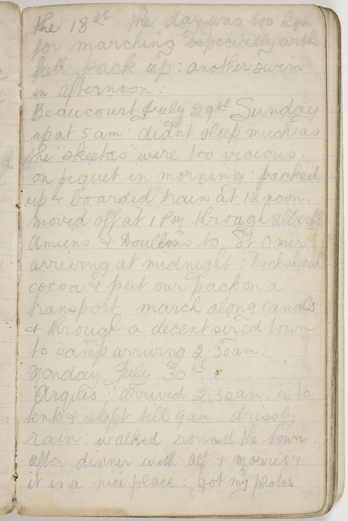 Up at 5 am : didn'r sleep much as the "skeetas" were too vicious : on piquet in morning : packed up & boarded train at 12 noon : moved off at 1 pm through Albert, Amiens & Doullens to St Omer arriving at midnight : "bucksheesh" cocoa & put our pack on a transport : march along canals & through a decent sized town to camp arriving 2.30 am.