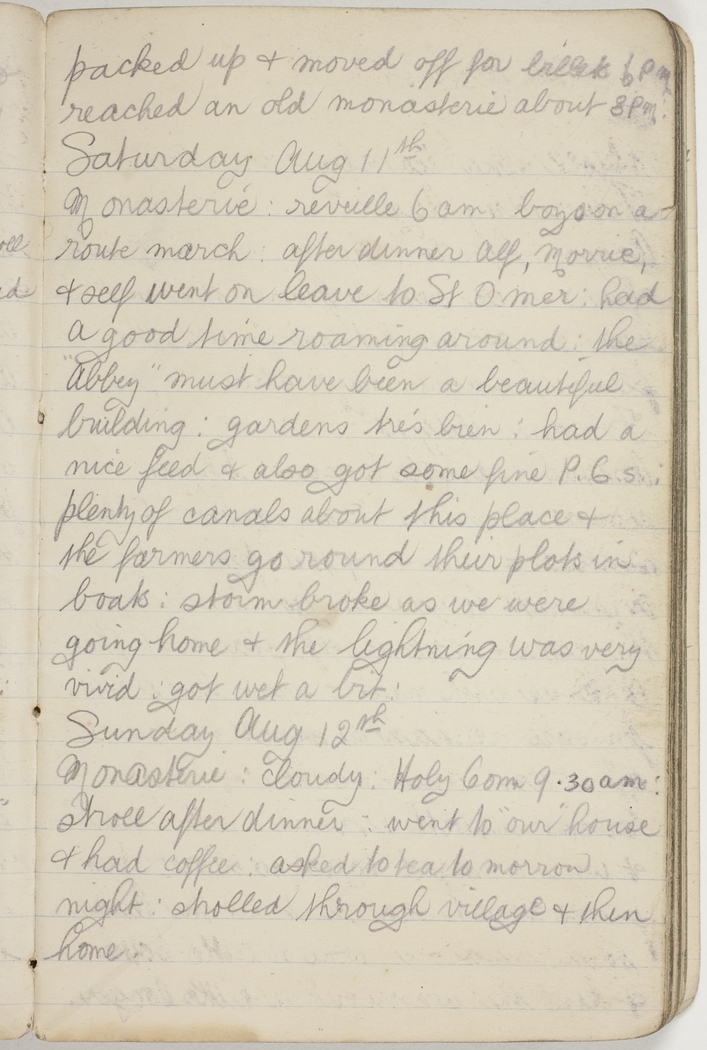 Monasterie : reveille 6 am : boys on a route march : after dinner Alf, Morrie, & self went on leave to St Omer : had a good time roaming around : the "Abbey" must have been a beautiful building : gardens tres bein : had a nice feed & also got some fine P.C.s : plenty of canals about this place & the farmers go round their plots in boats : storm broke as we were going home & the lightning was very vivid : got wet a bit :