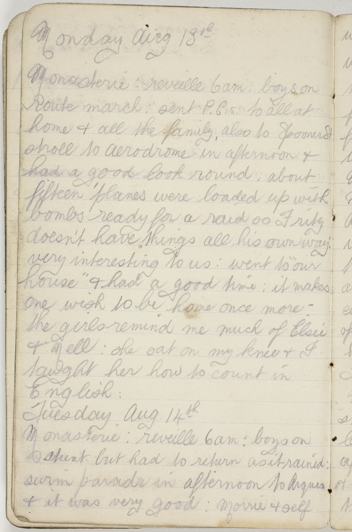 Monasterie : reveille 6 am : boys on route march : sent P.C.s to all at home & all the family, also to Spooner St : stroll to aerodrome in afternoon & had a good look round : about fifteen 'planes were loaded up with bombs ready for a raid so Fritz doesn't have things all his own way : very interesting to us : went to "our house" & had a good time : it makes one wish to be home once more : the girls remind me much of Elsie & Mell : she sat on my knee & I taught her how to count in English :