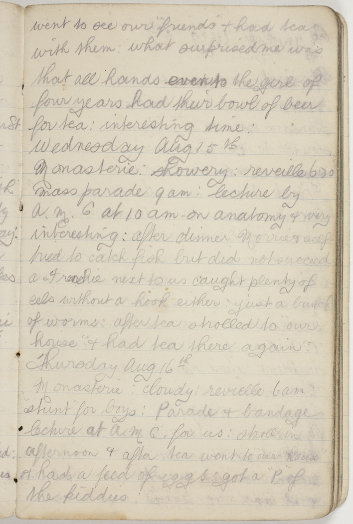 Monasterie : showery : reveille 6.30 : mass parade 9 am : lecture by A.M.C. at 10 am on anatomy & very interesting : after dinner Morrie & self tried to catch fish but did not succeed : a Frenchie next to us caught plenty of eels without a hook either : just a bunch of worms : after tea strolled to "our house" & had tea there again