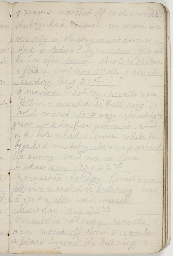 7.30 am & marched off to the woods : the boys had a stunt : we are only in the way so sat down & had a lecture ? by ourselves : followed the Coy after dinner : stroll to St Omer & had a good time strolling round