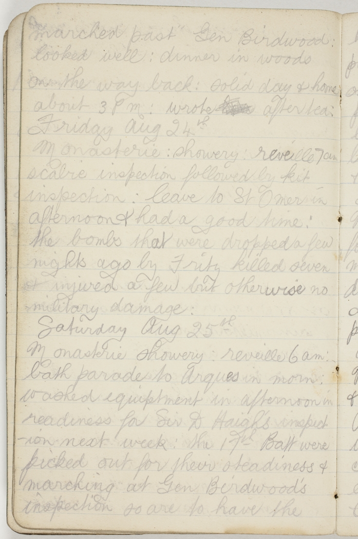 Monasterie : reveille 4 am : fell in & marched to the other side of Arques for a practice divisional inspection : Batt done well & were congratulated : one Batt out of each Bgde are to march past in Column of platoon is the latest
