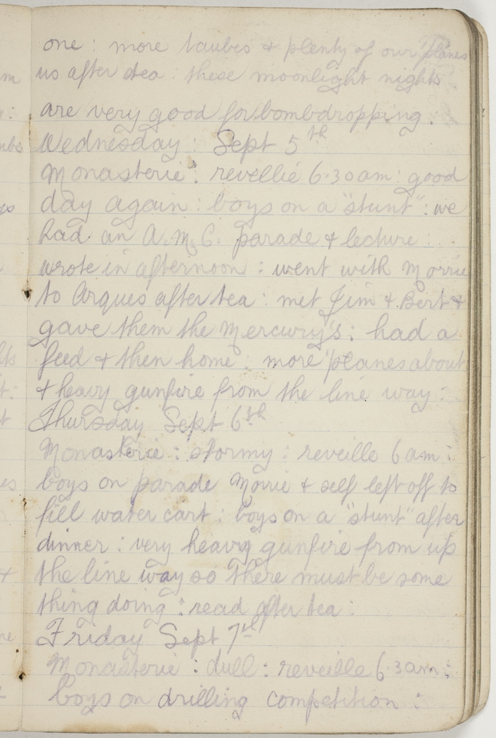 Monasterie : reveille 6.30 am : good day again : boys on a "stunt" : we had an A.M.C. parade & lecture : wrote in afternoon : went with Morrie to Arques after tea : met Jim & Bert & gave them the Mercury's : had a feed & then home : more 'planes about & heavy gunfire from the line way