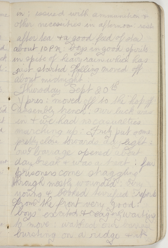 Ypres : moved off to the "hop off" assembly trench : our luck was in & we had no casualties marching up : Fritz put some pretty close towards day light : our barrage opened about daybreak & was a treat : few prisoners come straggling through mostly wounded : very young & looked terrified : report from the front very good : "boys" excited & eagerly waiting to move : watched our barrage bursting on a ridge & it