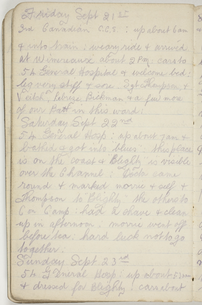 54 General Hosp : up about 7 am & bathed & got into "blues" : this place is on the coast & "Blighty" is visible over the Channel : Doctor came round & marked Morrie & self & Thompson to "Blighty" the others to Con Camp : had a shave & clean up in afternoon : Morrie went off before tea : hard luck not to go together
