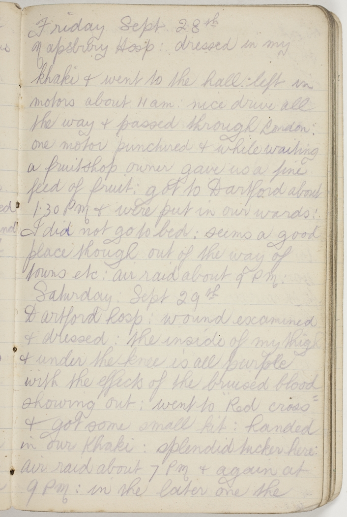 Dartford Hosp : wound examined & dressed : the inside of my thigh & under the knee is all purple with the effects of the bruised blood showing out : went to "Red Cross" & got some small kit : handed in our khaki : splendid tucker here : air raid about 7 pm & again at 9 pm : in the later one the