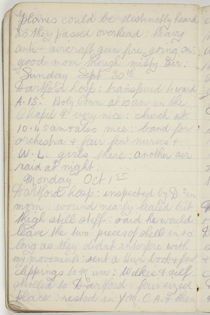 Dartford Hosp : transferred to ward A.15 : Holy Comm at 10 am in the Chapel & very nice ; church at 10.45 am & also nice : band for orchestra & fair few nurses & W.L. [Women's Legion] girls there : another air raid at night