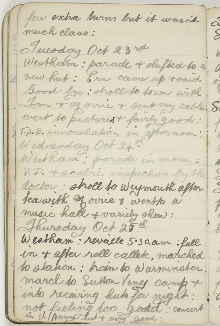 Westham : parade in morn : V.D. & scabie inspection by the doctor : stroll to Weymouth after tea with Morrie & went to a music hall & variety show