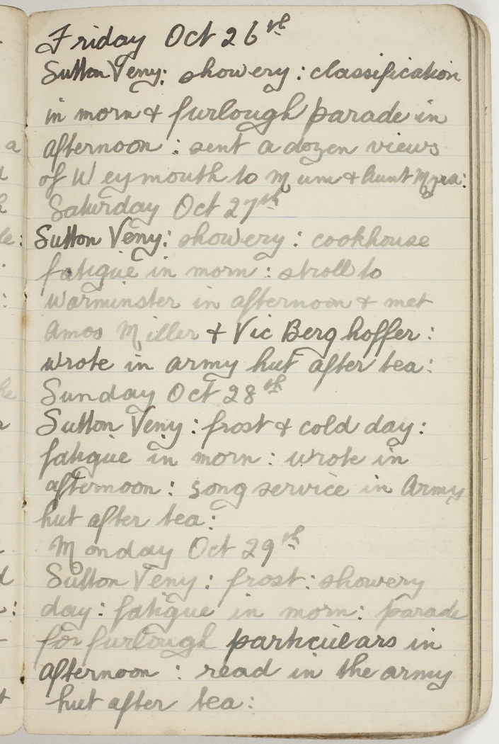 Sutton Veny : showery : cookhouse fatigue in morn : stroll to Warminster in afternoon & met Amos Miller & Vic Berghoffer : wrote in army hut after tea