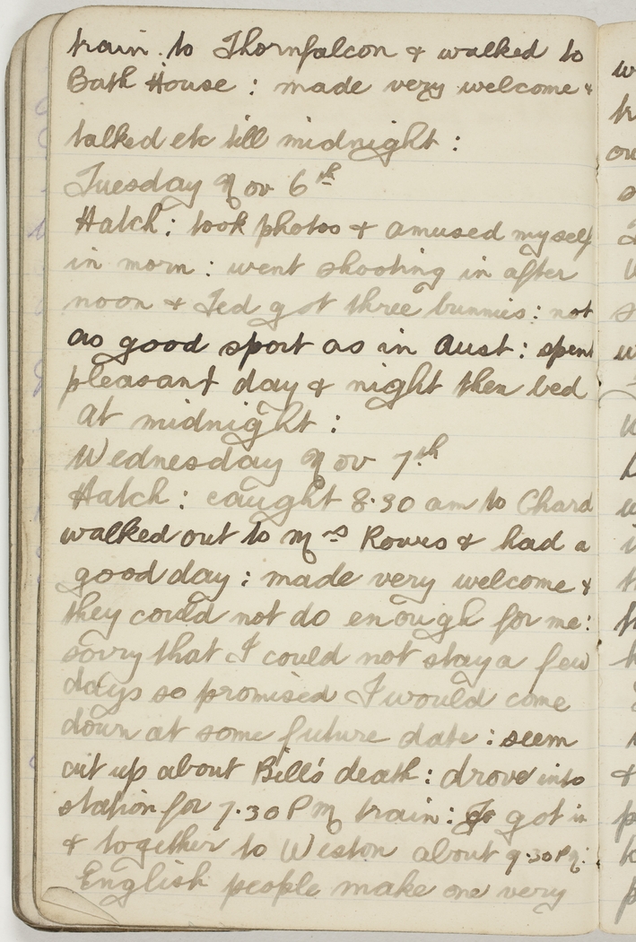 Hatch : caught 8.30 am to Chard : walked out to Mrs Rowes & had a good day : made very welcome & they could not do enough for me : sorry that I could not stay a few days so promised I would come down at some future date : seem cut up about Bill's death : drove into station for 7.30 pm train : Jo got in & together to Weston about 9.30 pm : English people make one very