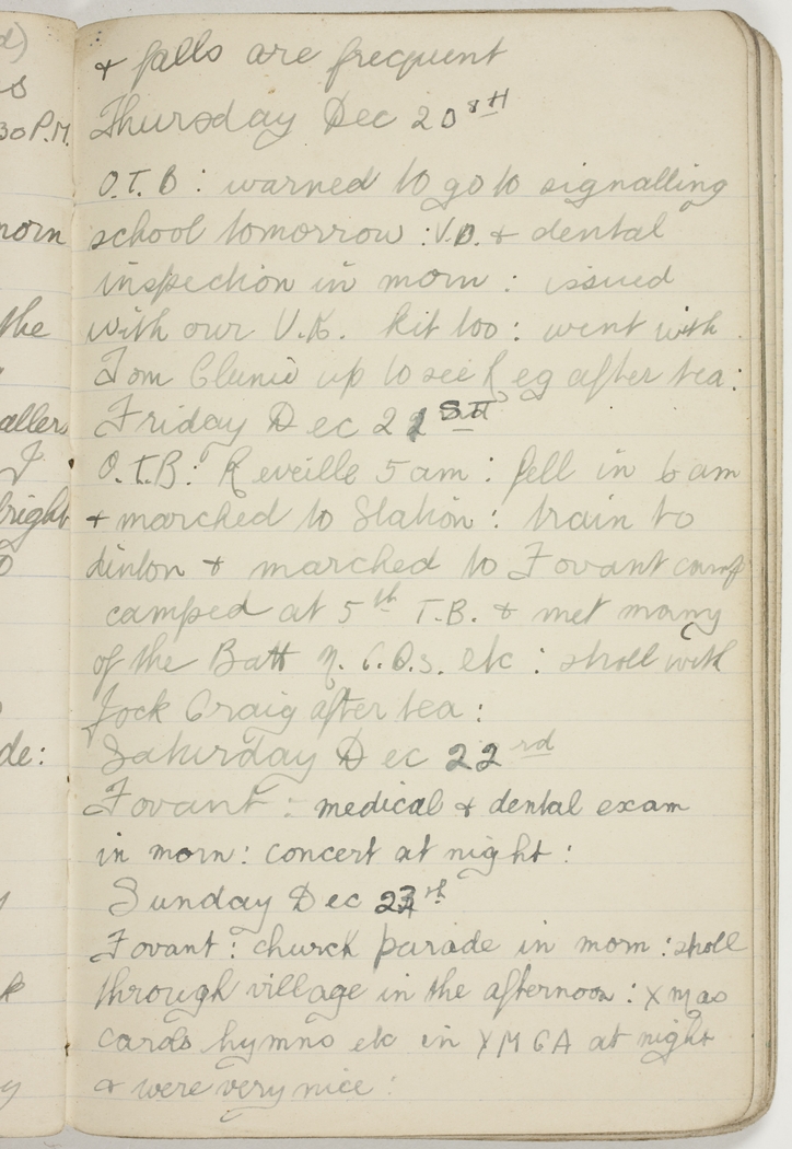O.T.B. : Reveille 5 am : fell in 6 am & marched to Station : train to Dinton & marched to Fovant camp : camped at 5th T.B. & met many of the Batt N.C.O.'s etc : stroll with Jock Craig after tea :