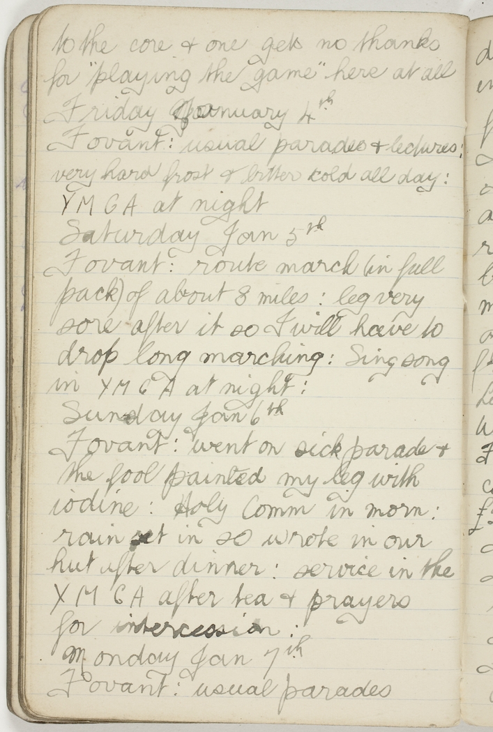 Fovant : went on sick parade & the fool painted my leg with iodine : Holy Comm in morn : rain set in so wrote in our hut after dinner : service in the YMCA after tea & prayers for intercession :