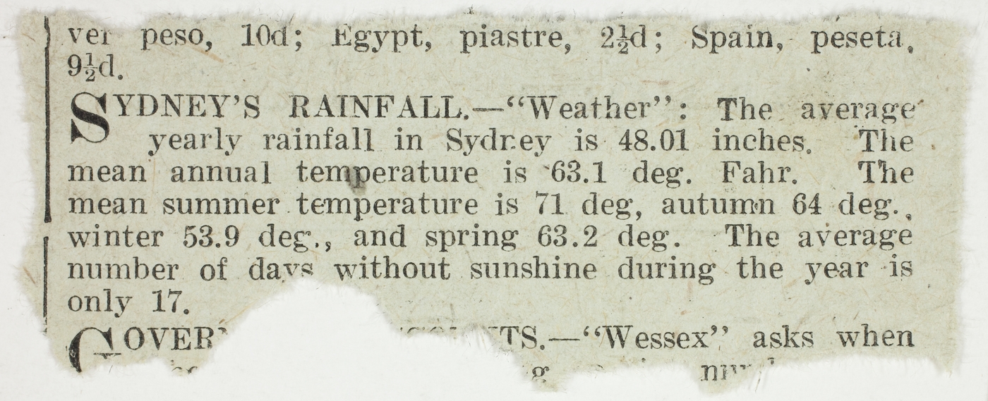 [Newspaper cutting re Sydney's Rainfall]