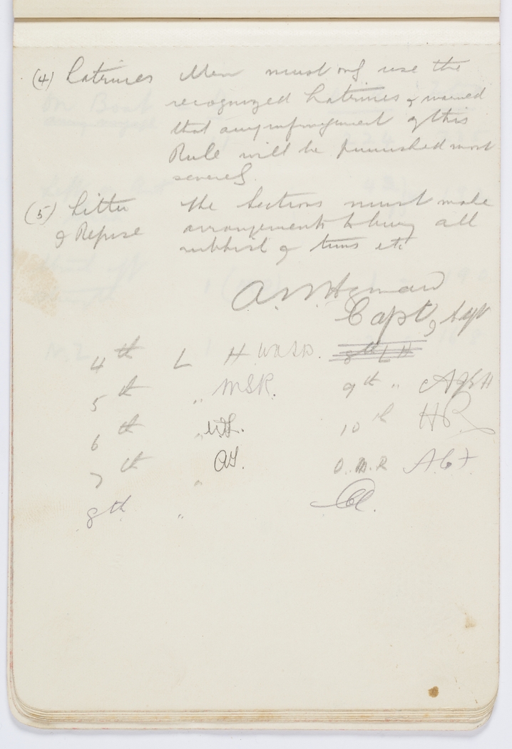 (4) Latrines Men must only use the recognized Latrines & warned that any infringement of this Rule will be punished most severely.
