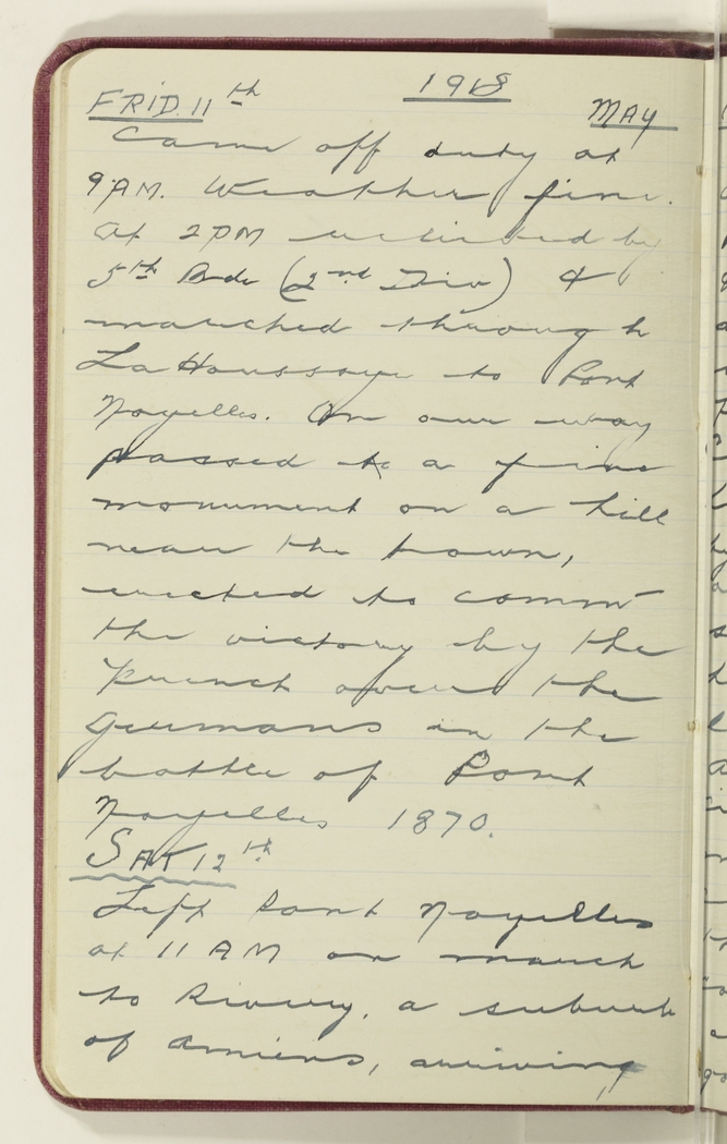 Came off duty at 9 am. Weather fine. At 2 pm relieved by 5th Bde (2nd Div) & marched through La Houssaye to Pont Noyelles. On our way passed a fine monument on a hill near the town, erected to comm. the victory by the French over the Germans in the battle of Pont Noyelles 1870.