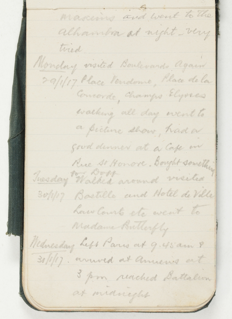 Left Paris at 9.45 am & arrived at Amiens at 3 pm, reached Battalion at midnight.
