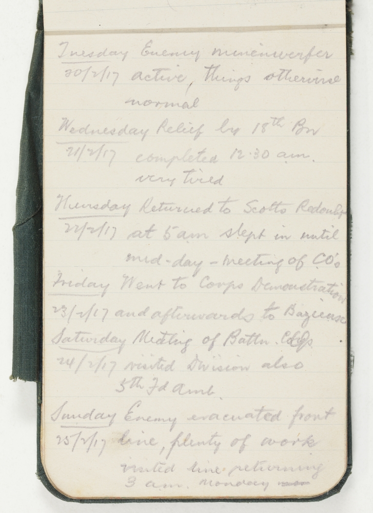 Enemy evacuated front line, plenty of work, visited line returning 3 am Monday.