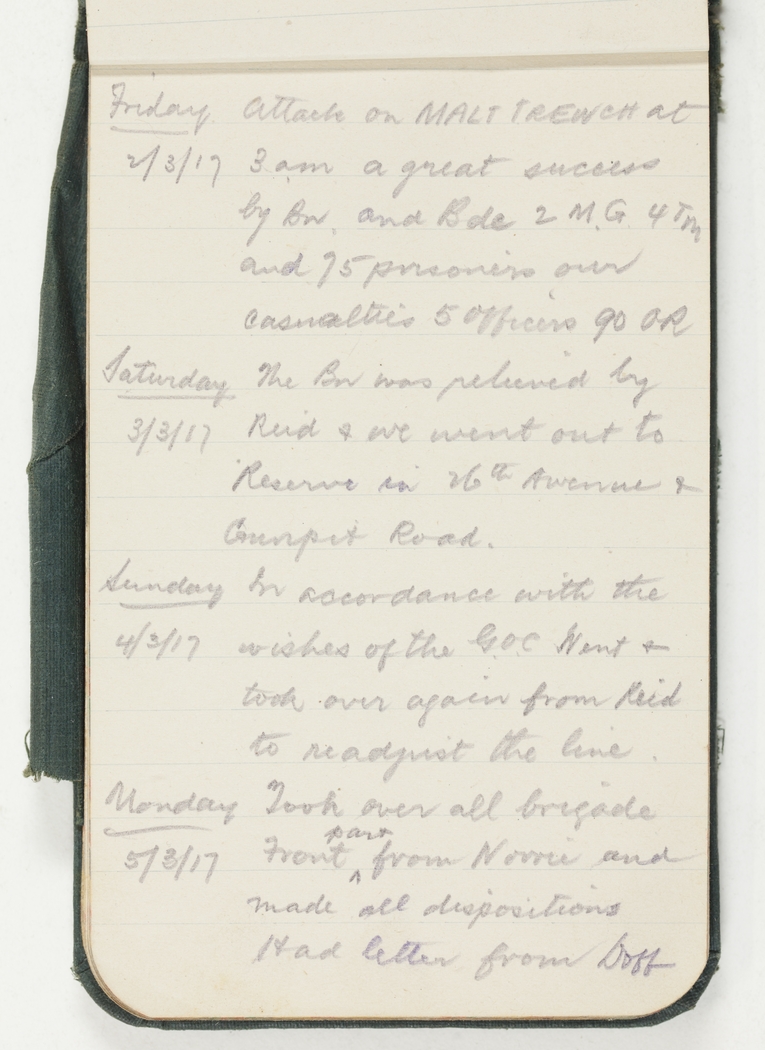Attack on MALT TRENCH at 3 am a great success by Bn, and Bde 2 M.G 4 T.M. and 75 prisoners out casualties 5 Officers 90 O.R.