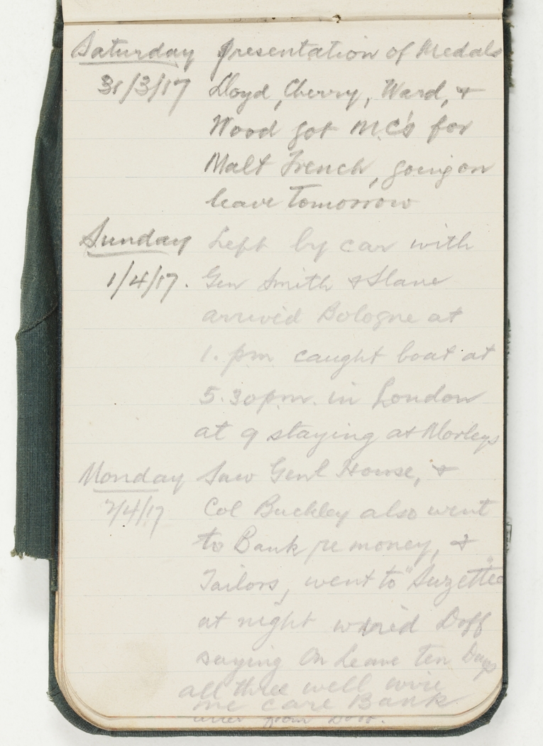 Left by car with Gen Smith & Slane, arrived Bologne [Boulogne] at 1 pm caught boat at 5.30 pm, in London at 9, staying at Morleys.