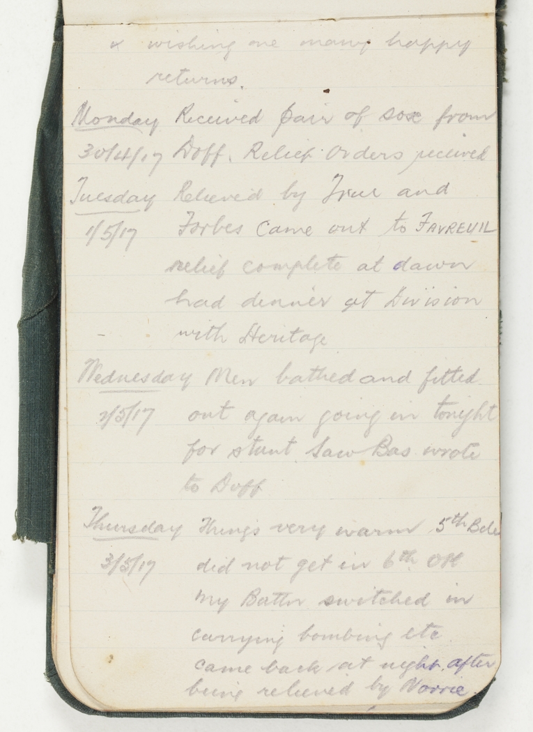 Relieved by True and Forbes came out to Favreuil, relief completed at dawn, had dinner at Division with Heritage.