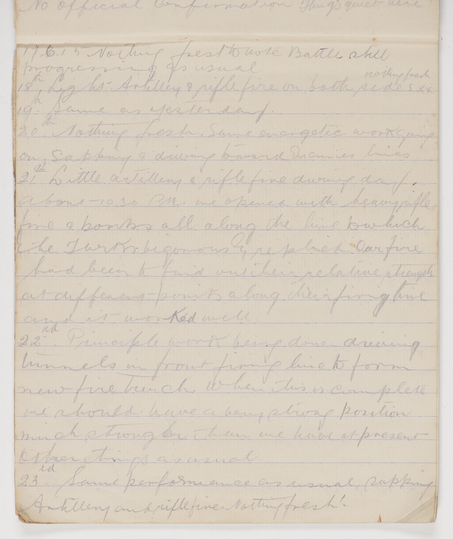 Little artillery & rifle fire during day. About 10.30 p.m. we opened with heavy rifle fire & bombs all along the line to which the Turks vigorously replied. Our fire had been to find out their relative strength at different points along the firing line and it worked well.