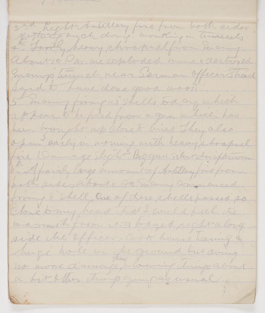A fairly large amount of Artillery fire from both sides about 6 p.m. Enemy commenced firing 6" shell. One of these shells passed so close to my head that I could feel the warmth from it & lodged right alongside the officers cook house, tearing a huge hole in the ground but doing no more damage than blowing things about a bit. Other things going as usual.