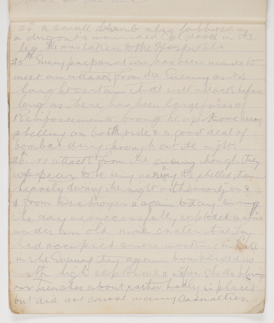 A small bomb also lobbed in a dugout & wounded Cpl Wood in the leg. He was taken to the Hospital.
