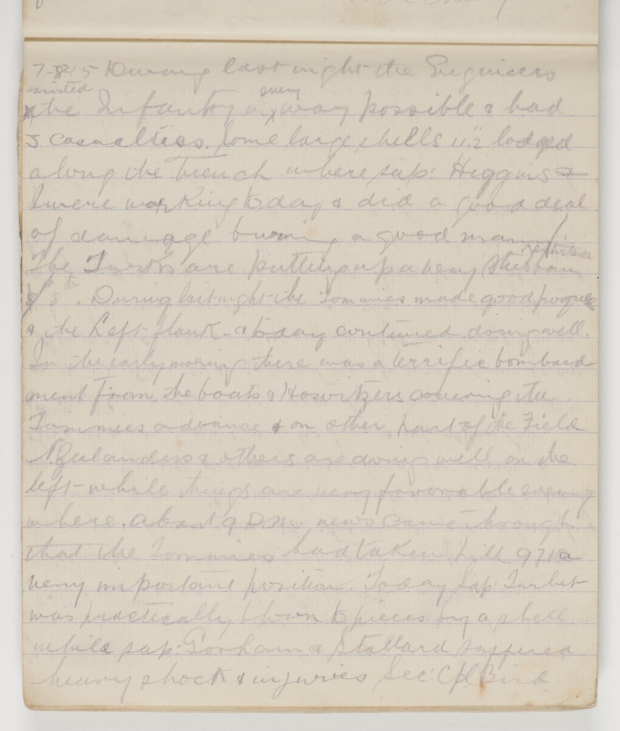 During last night the Tommies made good progress & the Left flank & today continued doing well. In the early morning there was a terrific bombardment from the boats & Howitzers covering the Tommies advance & on other part of the Field N. Zealanders & others are doing well on the left while things are very favorable everywhere. About 9 p.m. news came through that the Tommies had taken hill 971 a very important position. Today Sap. Turnbet was practically blown to pieces by a shell while Sap. Gorham & Stallard suffered heavy shock & injuries Sec. Cpl. Bird