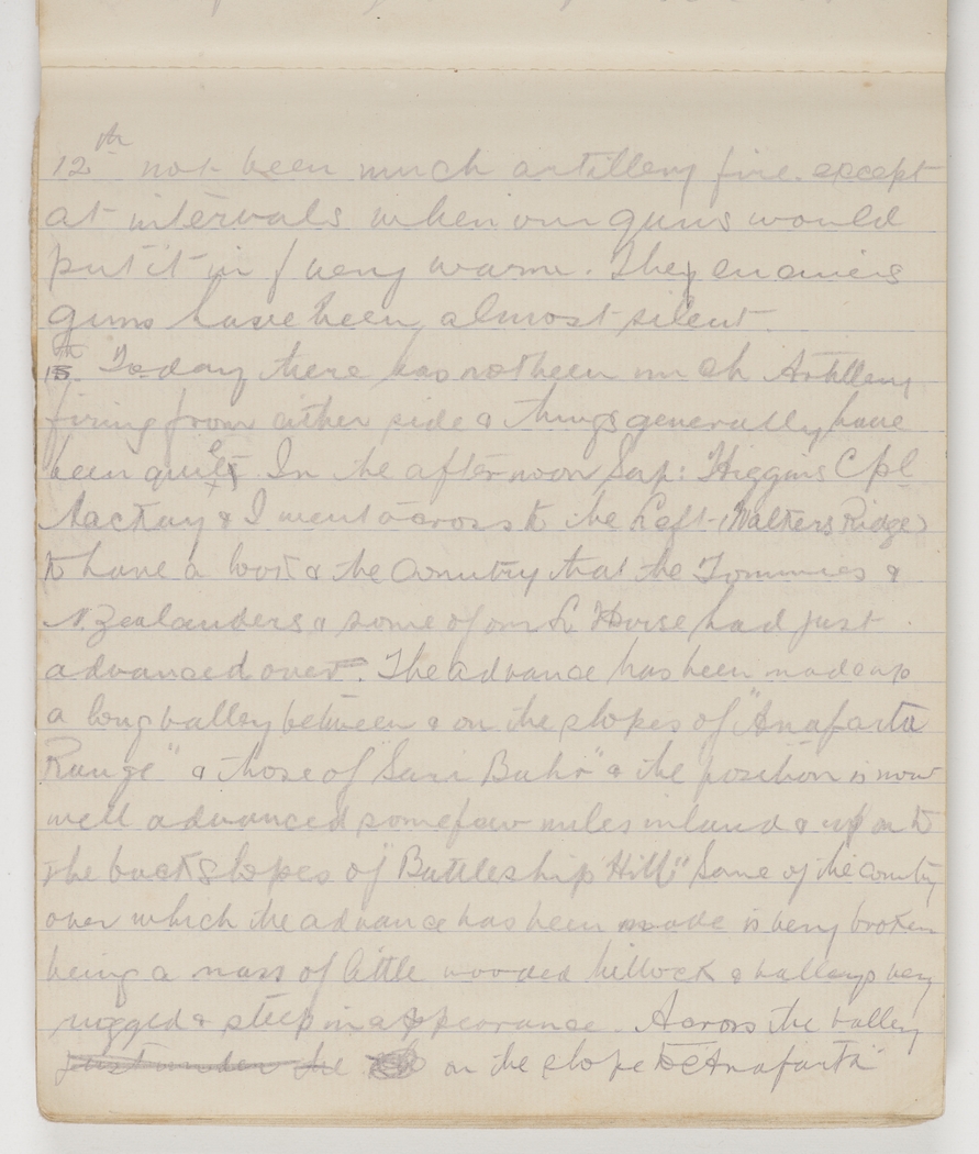 Today there has not been much Artillery firing from either side & things generally have been quiet. In the afternoon Sap: Higgins Cpl Mackay & I went across to be Left (Walters Ridge) to have a look & the country that the Tommies & N. Zealanders & some of our L. Horse had just advanced over. The advance has been made up a long valley between & on the slopes of "Anafarta Range" & those of "Sari Bahr" & the position is now well advanced some few miles inland & up on to the back slopes of "Battleship Hill". Some of the country over which the advance has been made is very broken being a mass of little wooded hillock & valleys very rugged & steep in appearance. Across the valley on the slope to "Anafarta"