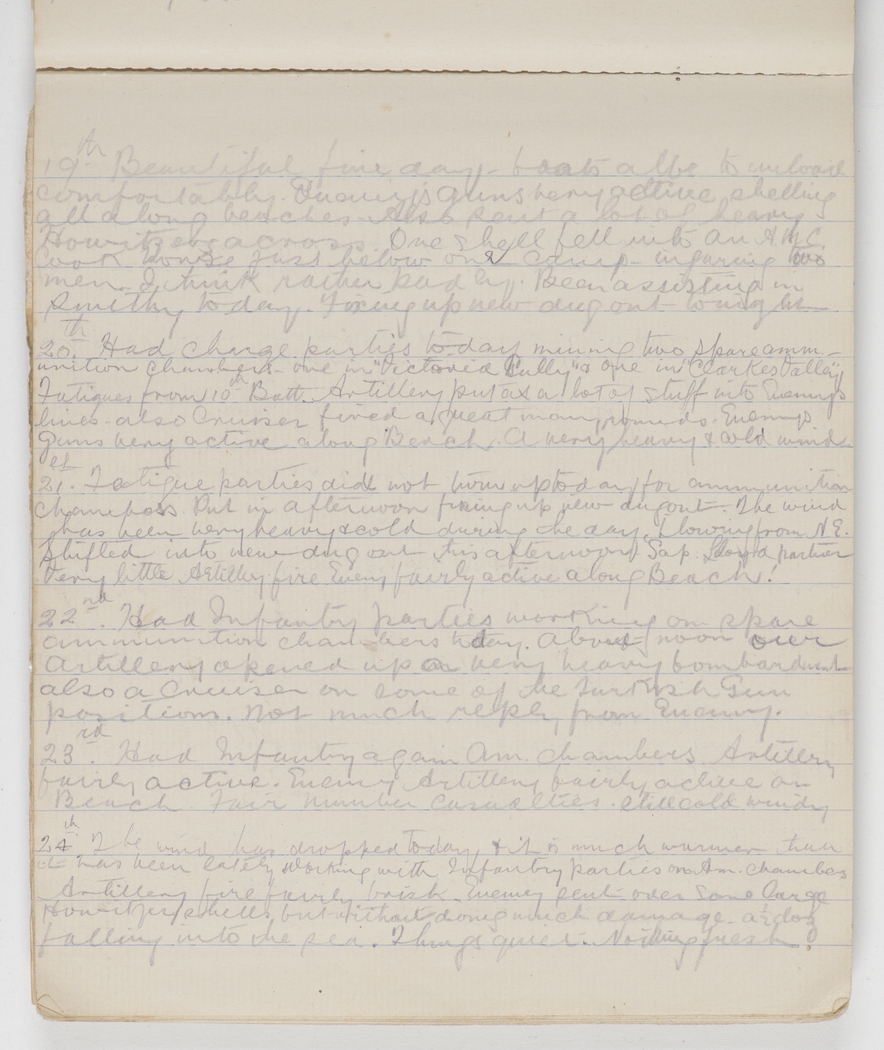 Had charge parties today mining two spare ammunition chambers – one in "Victoria Gully" & one in "Clarkes Valley". Fatigues from 10th Batt. Artillery put a lot of stuff into Enemys lines – also Cruiser fired a great many rounds. Enemys guns very active along Beach. A very heavy & cold wind.