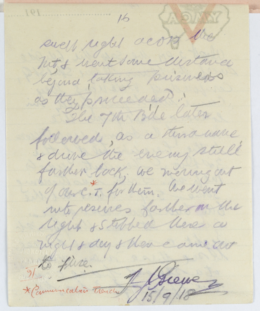 The 7th Bde later followed, as a third wave & drove the enemy still further back, we moving out of our C.T.* for them. We went into reserves farther on the right & stopped there a night & day & then came out to